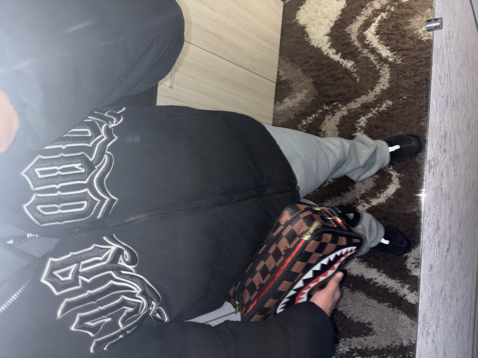 An individual is depicted from a high-angle, top-down perspective, appearing as a reflection in a mirror. The person is wearing a black puffer jacket featuring prominent white, stylized embroidery across the chest, which spells "VRATSA". They are also dressed in light grey sweatpants and black athletic shoes with white accents. In their left hand, the individual holds a rectangular bag characterized by a brown and black checkerboard pattern, red trim, and a distinctive shark-mouth graphic in white, red, and black on its side. The floor is covered by a brown and beige patterned shag rug. To the right, light-toned wooden cabinetry with horizontal metallic handles is visible. The scene is an indoor setting within the city of Vratsa, Bulgaria.