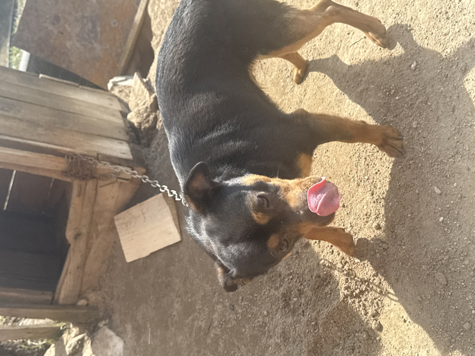 - "The image depicts a black and tan short-haired dog standing on dry, light brown dirt ground" by FM-tZgMG3, licensed under CC BY 4.0
