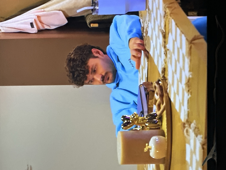 The image displays an interior scene located in Vienna, Austria, featuring an adult male seated at a wooden table. The man has dark, curly hair, a beard, and a mustache, and is wearing a light blue hooded sweatshirt with "josh" printed in a dark script on the chest. He is looking towards his left (viewer's right) with a neutral expression. His right hand rests on the table, which is partially covered by a light brown and white checkered table runner. On the table, to the left of the man, are a large, cylindrical light brown candle, a small, glossy white decorative apple with a golden stem, a golden, reflective balloon dog figurine, a dark blue notebook, and a small wooden bowl containing pretzels. A light blue insulated tumbler with a white straw is positioned on the table to the man's right. The background consists of a plain light-colored wall section on the left and a vertical dark brown panel on the right, from which a light pink towel and another darker fabric item are hanging.