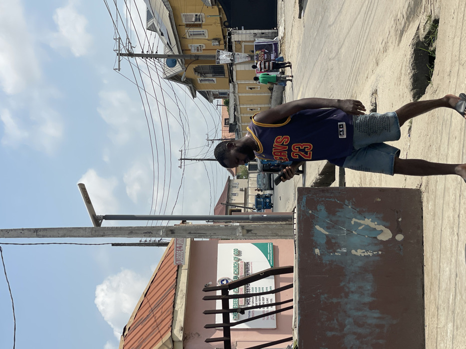 The scene depicts a daylight street view in Iranla, Nigeria, featuring a male subject in the foreground walking right-to-left