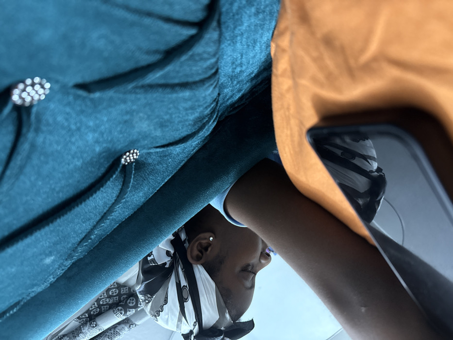 A close-up captures a partial view of a person with dark skin, donning a patterned headscarf, alongside an obscured smartphone reflecting their face. A plush, teal-colored upholstered surface adorned with decorative buttons dominates the upper-left quadrant. An orange-hued surface is visible to the right. The person's ear is pierced, and their eyes are closed or partially closed, suggesting relaxation or rest. The composition presents an intimate, informal perspective.