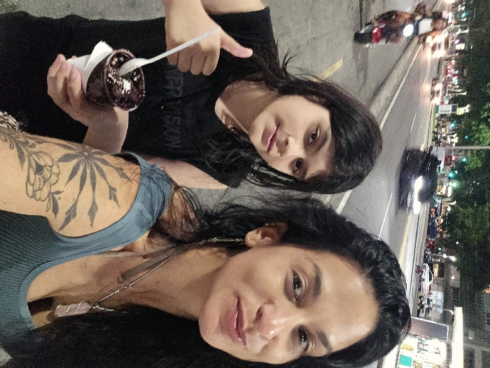 The scene, captured at night in Rio De Janeiro, Brazil, depicts an adult woman and a child on an urban sidewalk. The woman, positioned in the foreground on the right, has dark, long hair, wears a light blue ribbed tank top, and a necklace with a pink crystal pendant. A tattoo featuring a radiating leaf pattern and a flower is visible on her right bicep. She is looking directly at the camera. To her left, a child with dark, shoulder-length hair stands, holding a white cup filled with a dark purple substance and toppings, likely açaí, with a white plastic spoon. The child wears a dark sleeveless top and extends her right hand in a thumbs-up gesture, also looking towards the camera. Behind them, a multi-lane street is active with vehicle traffic, illuminated by streetlights, headlights, and taillights. A person on a scooter is visible on the far left, and a dark-colored car with bright headlights is in the mid-ground. Urban structures and businesses are discernible along the far side of the street.