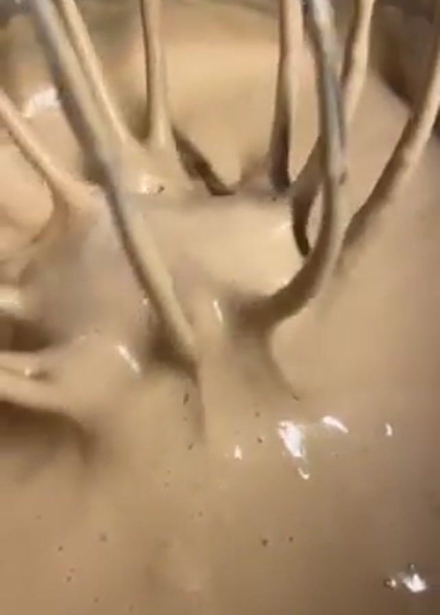 A silver electric mixer stirs a light brown batter in a silver mixing bowl. The batter is smooth and slightly foamy, with a few small bubbles visible. The mixer is lifted from the batter, and the batter forms a thick, ribbon-like trail as it drips back into the bowl. Background voices are speaking in Spanish.