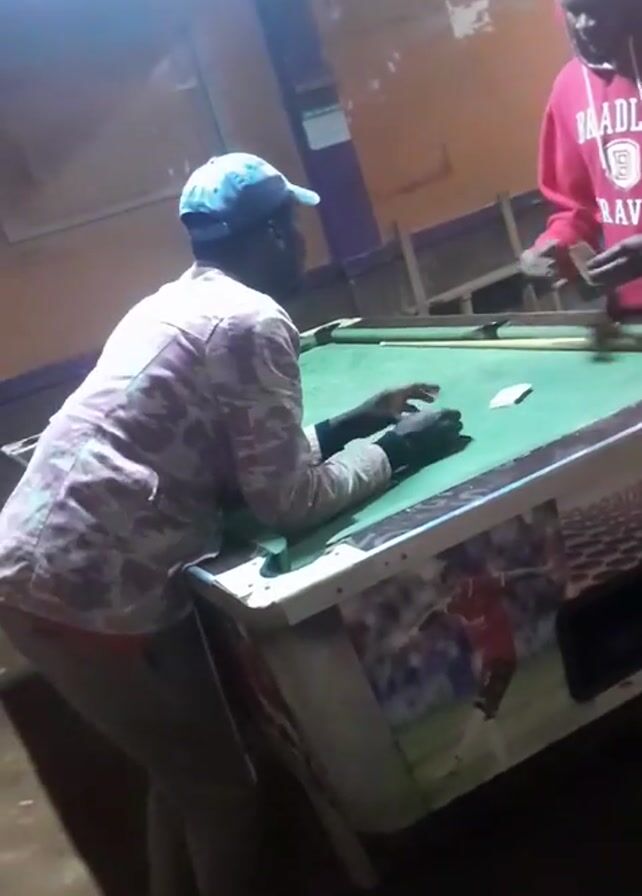 pool hall scene. Two people are visible in the foreground, standing around a pool table. One person, wearing a cap and a light-colored patterned jacket, leans over the table, with gloved hands placed on the green felt. A pool cue rests nearby. Another person, wearing a red hoodie, stands to the side, shuffling playing cards. In the background, another person is partially visible. The room has painted walls, with the pool table decorated with what appears to be a soccer image on its side. Lighting is somewhat dim and artificial.