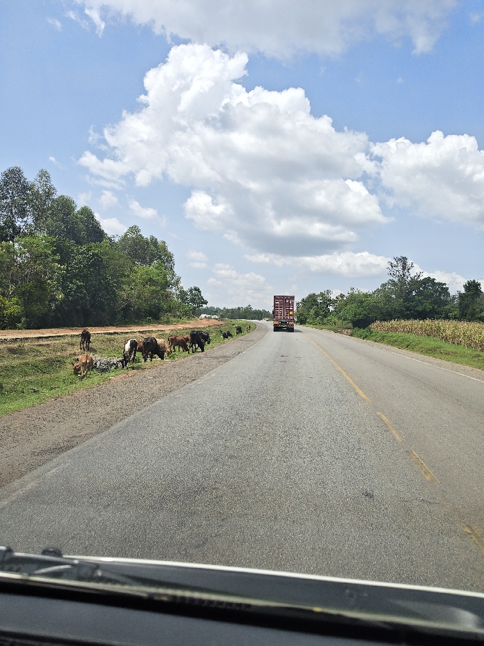 A straight asphalt road stretches into the distance under a partly cloudy sky. A yellow line marks the road's center. A truck travels on the right side of the road. To the left, a herd of cattle grazes along the roadside vegetation. Trees line the road in the distance on both sides. A portion of a vehicle's interior, possibly a dashboard or windshield, is visible at the bottom of the image.