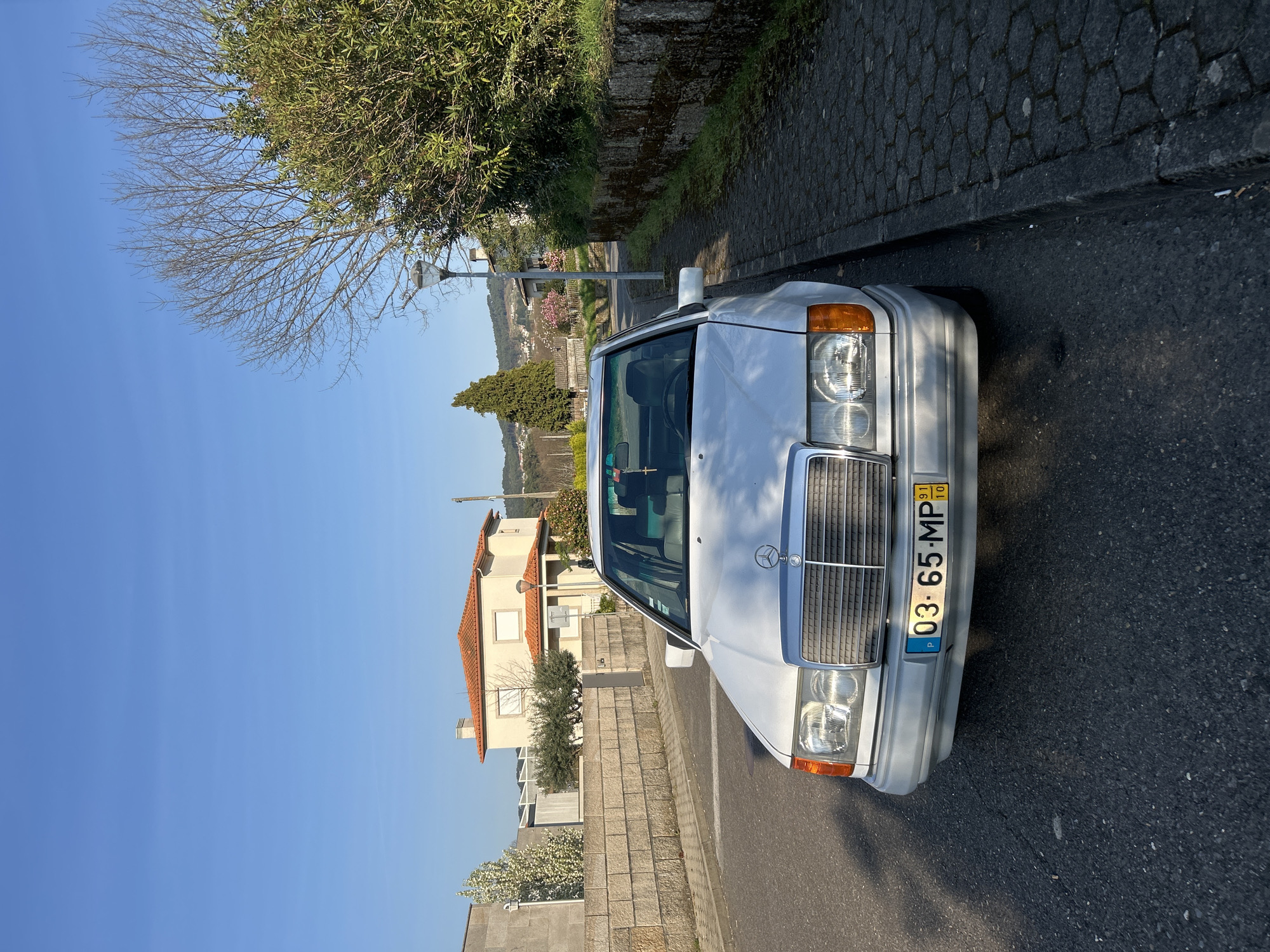 A white Mercedes-Benz sedan, bearing Portuguese license plate "03-65-MP" with a "91/10" date stamp, is parked facing the viewer on an asphalt road in a residential area of Vila Real, Portugal. The vehicle occupies the right side of the road, adjacent to a hexagonal cobblestone-patterned sidewalk and a low stone wall. The car's interior features light-colored seats, and a red and black object hangs from the rearview mirror. To the immediate right, a dense green bush partially obscures a bare deciduous tree and a modern streetlamp. In the background, on the left side of the street, a two-story house with light-colored stucco walls and an orange tiled roof is visible behind a stone block wall, along with flowering white trees. Distant hills with scattered structures and vegetation are present under a clear blue sky. Sunlight illuminates the scene from the left, casting shadows from the vehicle. No individuals are visible, and no specific actions or interactions are depicted.
