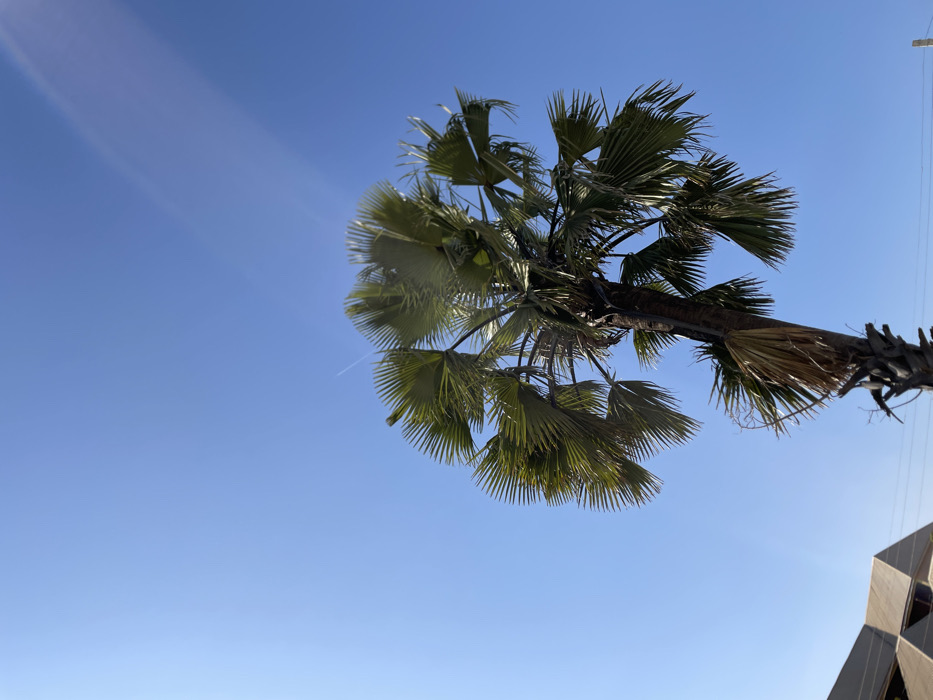 A tall palm tree with a thick, textured trunk and numerous green, fan-shaped fronds occupies the center-right of the frame, reaching towards a clear, bright blue sky