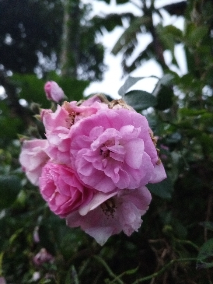 The image captures a close-up, shallow-depth-of-field view of a cluster of approximately seven pink roses and one unopened rose bud, situated in Catarman, Philippines. The roses display varying shades of pink, from vibrant magenta to soft pastel, with some petals exhibiting minor browning and visible water droplets. The background is heavily blurred, consisting of dark green foliage and indistinct tree trunks or branches against a lighter, overcast sky, characteristic of an outdoor garden or natural setting. No human subjects, animals, or artificial structures are discernible. The scene depicts static floral elements.
