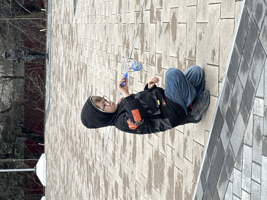 - "A young Caucasian male child, estimated 6-9 years old, wearing eyeglasses, a black hooded jacket with orange details, blue denim jeans, and dark athletic shoes, is depicted in a crouching position on a paved plaza in Makiivka, Ukraine" by FM-RJWfF2, licensed under CC BY 4.0