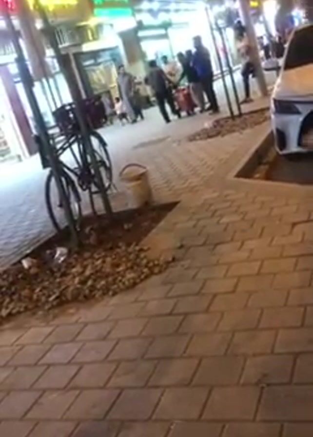 street scene at night. Several people are gathered around a cart on the sidewalk, near a row of storefronts with illuminated signs in a foreign language. A bicycle is parked on the sidewalk near some landscaping, and a white car is parked along the curb. The person filming is standing on the sidewalk, and a person wearing a grey hoodie obscures part of the view in the right side of the frame.