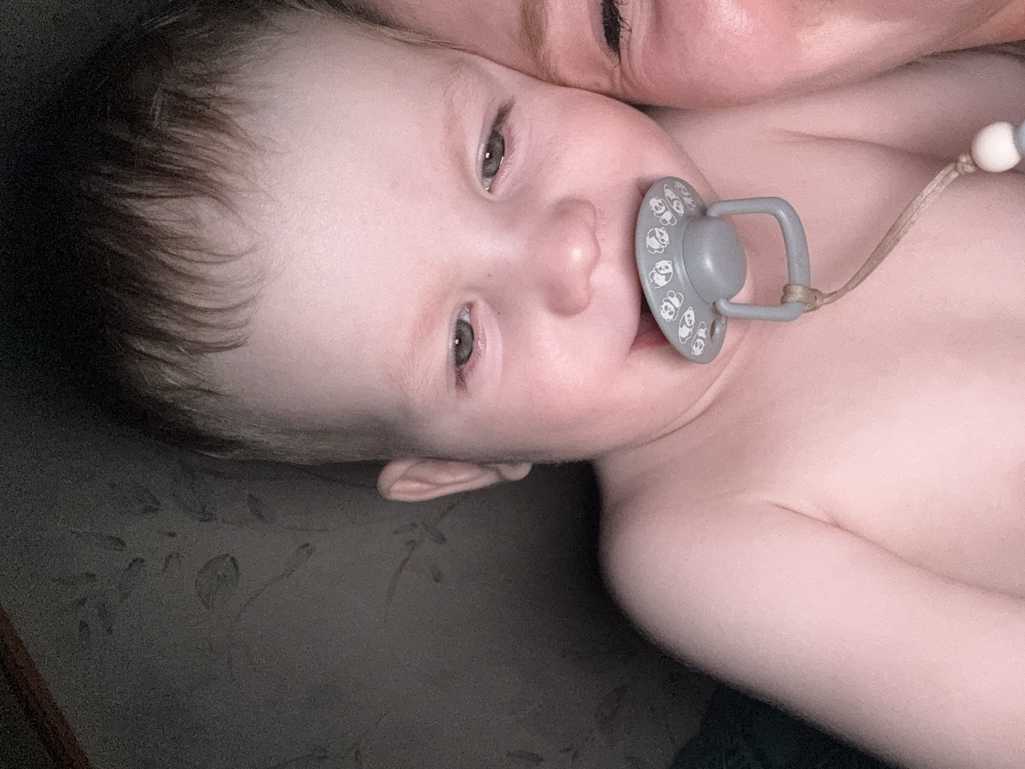 A close-up, slightly angled shot features a baby with fair skin and light brown hair with a gray pacifier in their mouth