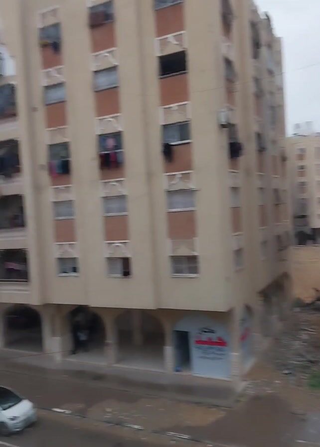 n exterior shot of an urban scene on a cloudy, wet day. In the foreground, a street is visible with wet asphalt reflecting the light. Cars drive along the street, including a silver hatchback. Buildings are the primary subjects. The closest is a multi-story apartment building with light beige facade, rust-colored accents around the windows, and arches supporting the ground floor. The balconies have clothes hanging on them. In the background, a shanty town or refugee camp consisting of makeshift shelters, possibly tents, stretches out toward the horizon. A light pole stands near the street with electrical wires crossing the frame. People can be seen walking in the distance near the shelters. The overall impression is one of a drab and possibly impoverished urban environment.