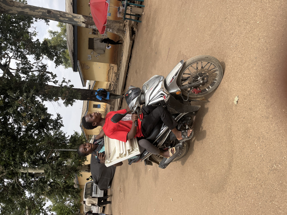 The image depicts an outdoor daylight scene on an unpaved, light brown road in Rafin Par, Nigeria