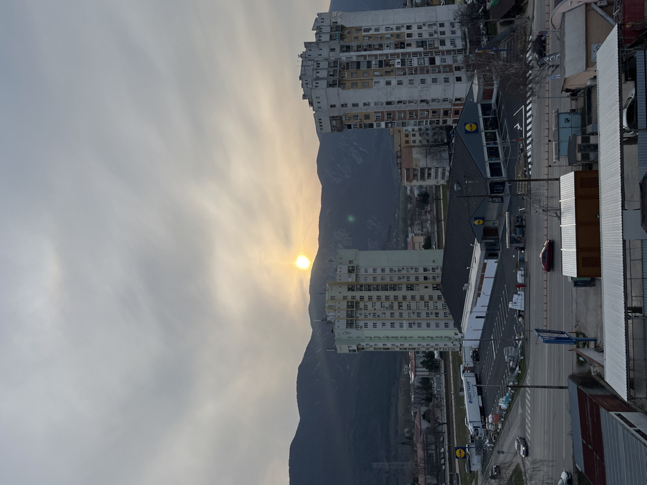 The image provides an aerial-level, panoramic view of a section of **Vratsa, Bulgaria**, specifically the area encompassing the Lidl supermarket located at ul. "Ivancho Tsvetkov" 20. The scene is illuminated by the low-lying sun, visible as a bright, yellow-orange orb on the horizon, indicative of either sunrise or sunset, under an overcast sky with muted grey and yellow cloud formations. In the mid-ground, a prominent modern Lidl supermarket building, distinguished by its dark grey roof and yellow circular logos, is centrally located. An associated asphalt parking lot borders the supermarket, containing a white semi-trailer truck with "BUNEY TRANS" visible on its side, a white delivery van, and various stacked construction materials or storage items. A multi-lane asphalt road, traversing horizontally across the frame, shows minimal vehicular traffic, including a red sedan in motion and several parked vehicles. Two distinctive multi-story residential apartment buildings stand in the background behind the supermarket. The building on the left exhibits a lighter, possibly faded green or yellow facade with numerous window and balcony units. The building on the right is predominantly off-white or light grey, appearing more weathered, also featuring multiple windows and balconies. Further in the background, a substantial range of dark, undulating mountains forms the natural horizon, partially obscured by atmospheric haze. Various smaller urban structures, utility poles, streetlights, and sparsely leafed deciduous trees are distributed throughout the visible landscape. No individuals are clearly visible within the frame.