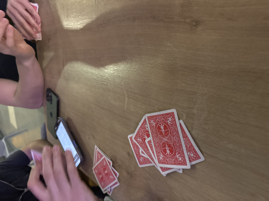 - "An indoor scene in Blagoevgrad, Bulgaria, depicts a wooden table serving as the primary surface for a card game involving at least two individuals" by FM-vgQoj1, licensed under CC BY 4.0