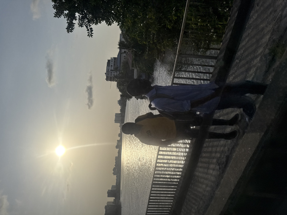 Two people stand on a bridge or elevated walkway next to a body of water reflecting the setting sun. The person in front wears a yellow shirt, while the person behind wears a blue shirt and a backpack. Buildings can be seen in the distance across the water, and the sky is partly cloudy. Vegetation is visible above the bridge or walkway.