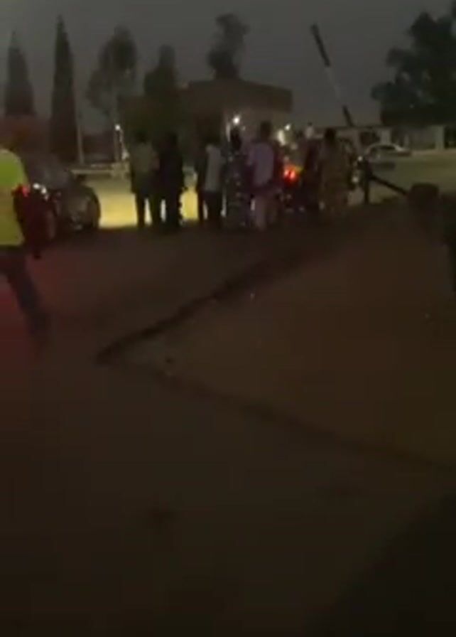 group of people gathered on a street at dusk or night. The street is paved but appears to be in disrepair with visible cracks and uneven surfaces. A gate with black and white striped bars is in the foreground, partially obstructing the view. In the middle ground, several individuals are clustered together. Some are wearing traditional clothing, while others are in more casual attire. There's a parked vehicle with its brake lights on, suggesting it may be part of the group. A person wearing a bright yellow or green shirt walks toward the group from the left side of the frame. The environment is generally dark, with some illumination from streetlights and possibly headlights from vehicles. In the background, buildings and trees can be discerned, but details are limited due to the lighting conditions.