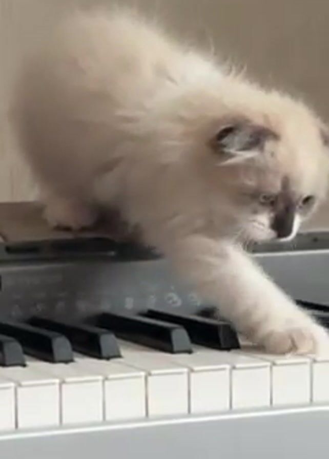 A video shows a light-colored kitten with gray and black markings standing on a silver-colored keyboard