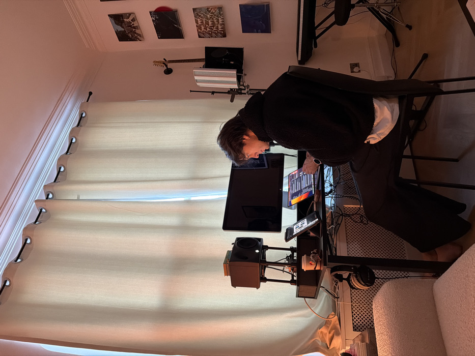 An indoor room, likely a home office or studio, is depicted in Unknown, Unknown. A male individual with medium-length dark hair is seated at a black desk, facing right and concentrating on a laptop screen. He is wearing a black fleece hoodie over a white t-shirt, dark wide-leg trousers, and a smartwatch on his left wrist; his right hand is engaged with the laptop's input. The black desk holds a professional audio setup. From left to right: a black studio monitor speaker elevated on a stand with books stacked atop it, a white paper coffee cup, an iPad on a stand displaying a graphic interface, an open MacBook laptop displaying a colorful digital interface, and a large black Apple iMac monitor with a dark screen. Over-ear headphones hang from the left side of the desk. Numerous cables connect the electronic devices. Behind the desk, a large window is mostly obscured by two light-colored grommet-style curtains, with natural light visible filtering through a narrow vertical gap. To the right, a cream-colored electric guitar is mounted on the wall above a gray-striped acoustic panel. Below these, four framed items are arranged vertically: The Beatles' "Abbey Road" album cover, a dark square frame with a red element, a classical-style artwork, and a dark blue abstract piece. A white musical keyboard rests on a black stand to the far right. A white radiator is located beneath the window, and a section of a cream-colored textured armchair occupies the bottom left foreground. White crown molding lines the top of the walls. The room is illuminated by a combination of natural light from the window and warm-toned artificial light.