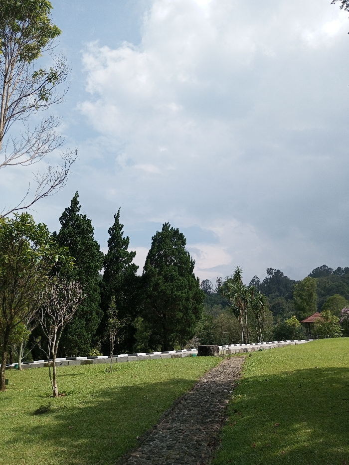 A scenic landscape features a stone pathway cutting through a grassy field, leading toward a line of diverse trees. Behind the trees, a distant, lush green hillside is visible. The sky is partially overcast with a mix of blue patches and heavy, dark clouds. A hint of a small structure is seen to the right, nestled among the greenery. Bare branches are visible on a tree to the left of the frame, adding a touch of contrast to the verdant setting.