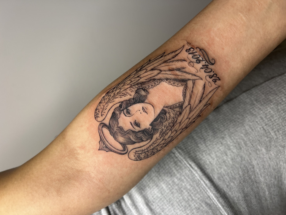 The image displays a close-up view of a person's inner forearm, featuring a black and grey tattoo of an angel