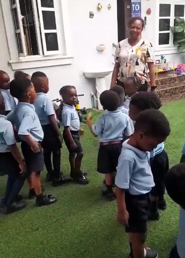 A medium shot shows a group of young children, mostly boys, standing in a semicircle on a patch of artificial turf. They are all wearing similar school uniforms consisting of light blue polo shirts and dark shorts. They are facing a woman standing in front of a white building with multiple windows. The woman is wearing a light-colored patterned shirt. There's a small white sink mounted on the wall behind her. Colorful decorations hang above the door. The woman appears to be addressing the children. The children are looking in different directions, some at the woman, others at the ground or to the side.