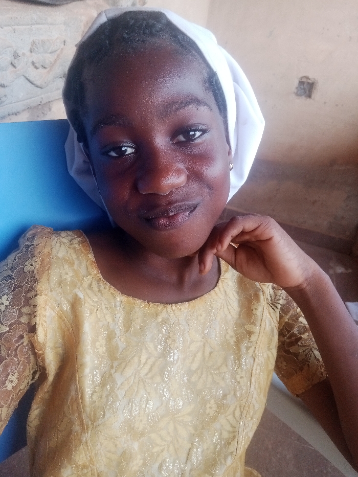 A single individual, appearing to be a young female with dark complexion, is positioned centrally, facing the camera. Her hair is partially covered by a white headscarf. She wears a light gold, short-sleeved top with a prominent lace or brocade floral pattern. Her left hand is raised, with fingers resting against her chin or jawline. A small, light-colored earring is visible in her right earlobe. Her expression is a slight smile, and her gaze is directed forward. The background consists of a vibrant blue surface to the subject's left, likely a chair or partition. The wall behind and to the subject's right is a light brown or beige, appearing to be plaster or a similar textured material. On the upper left portion of this wall, a decorative, carved, or molded pattern depicting stylized leaves is visible. On the upper right, a small, dark, rectangular void or mark is present on the wall. The lighting is bright and even, suggesting an indoor or sheltered outdoor environment. The image does not contain specific visual markers to confirm the precise location within Ajibade, Nigeria.