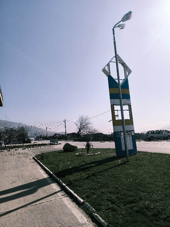 An outdoor scene in Shivachevo, Bulgaria, is depicted under a clear, light blue sky with bright sunlight casting distinct shadows from the upper right. The foreground features a concrete paved area on the left, exhibiting cracks and worn white markings along its curb. Adjacent to this on the right is a patch of green grass, also bordered by a concrete curb. Dominating the midground on the right is a tall, vertical structure, possibly a monument or a large sign. It is primarily blue with a central horizontal yellow band, and its upper portion forms an open, diamond-shaped frame. A grey metal streetlamp pole with two functional luminaires is affixed to the front of this structure. The structure appears weathered, with some internal panels or sections missing. To the left of this central structure, a large, light-colored, irregularly shaped rock or boulder rests on the grass. Beside it, a small, dark, spiky plant or decorative element is present within a circular demarcation on the grass. In the background, utility poles supporting multiple overhead power lines extend horizontally across the scene. Bare deciduous trees, consistent with winter or early spring, are scattered throughout the background. Distant buildings, including what appears to be a small kiosk or shelter, are faintly visible. On the far right, a light-colored SUV is visible on a paved road. Beyond these elements, hills or mountains are discernible against the horizon. No individuals are present in the scene.