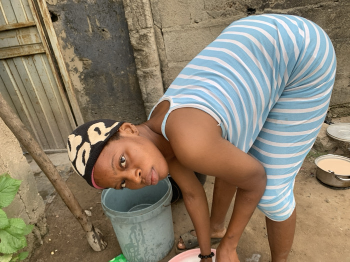 A young Black female, estimated to be in her twenties, is captured in an outdoor residential setting in Minna, Nigeria. She is bent forward at the waist, looking directly towards the camera with a neutral expression. She wears a black beanie with light-colored patterning and a light blue and white horizontally striped sleeveless dress or long top. Her bare feet are visible, and a dark bracelet is on her left wrist. To her immediate right (viewer's left), a light blue/grey plastic bucket containing liquid is present. Further to her right (viewer's right), on the uneven dirt ground, two metallic pots or bowls are visible; one is covered, and the other contains a light brown liquid. A rustic wooden tool, resembling a shovel or hoe handle, leans against a concrete wall to the viewer's left. The background features a distressed concrete wall with dark, possibly moldy or painted, patches, and a weathered, metallic door or gate to the far left. Green foliage is partially visible in the lower left foreground. The scene is illuminated by natural daylight.