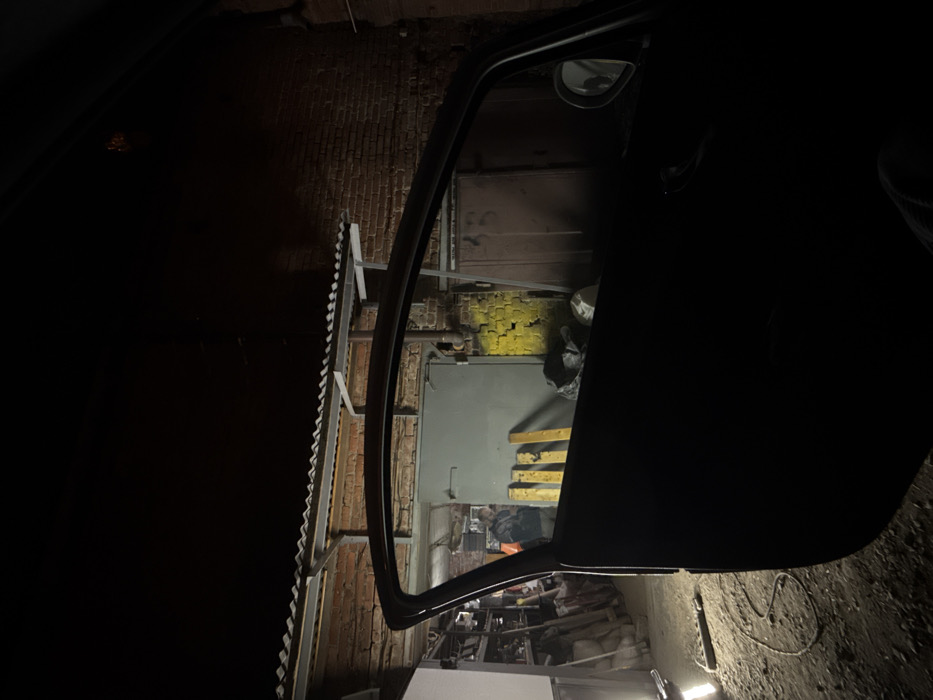 The scene depicts an outdoor or semi-enclosed area at night, viewed from the interior of a dark vehicle with its driver's side door open. The location is an alleyway or service area adjacent to a garage or workshop building in the city of Unknown, Unknown. The environment features a reddish-brown brick wall in the background, surmounted by a corrugated metal awning or roof structure. The ground consists of uneven dirt or gravel. Artificial light illuminates the scene, with a bright white LED work light positioned on the ground to the far left, near a coiled black cable. A large, light-grey metal door is centrally visible within the brick wall. To its right, a section of the brick wall is marked with bright yellow spray paint, and further right, a dark wooden door or panel is present. To the left of the grey door, shelving units containing various items are partially visible. In the middle ground, several yellow wooden planks lean against the wall near the grey door, and a black trash bag with other debris is present near the yellow-painted wall. One male individual is observed standing in the middle ground through the open car door. He appears to be middle-aged or older, with a beard, and is wearing a multi-colored jacket. His hands are positioned near his chest, suggesting he is holding an object or engaged in an activity, but the specific action or object is indistinct. He is not interacting with the vehicle. The foreground is dominated by the dark interior and open frame of the car door, with a side mirror visible on the right.