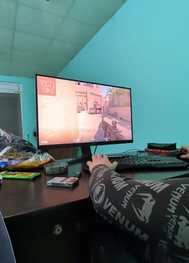 A person is playing a first-person shooter game (likely Counter-Strike) on a desktop computer. The game is displayed on a large monitor. The player's left hand is on the keyboard, and their right hand is on the mouse. The player is wearing a long-sleeved black shirt with white "VENUM" logos. The desk also has a pack of cigarettes, an ashtray, and some opened bags of snacks. The room has a blue wall.