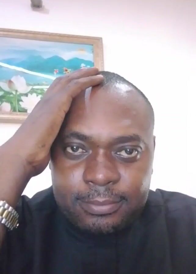 A medium-shot video shows a man, facing forward, running his hand through his short, dark hair
