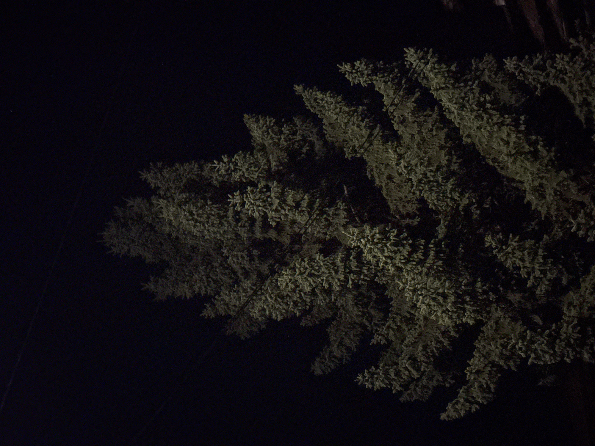 A nighttime photograph shows the boughs of a conifer tree against a dark sky