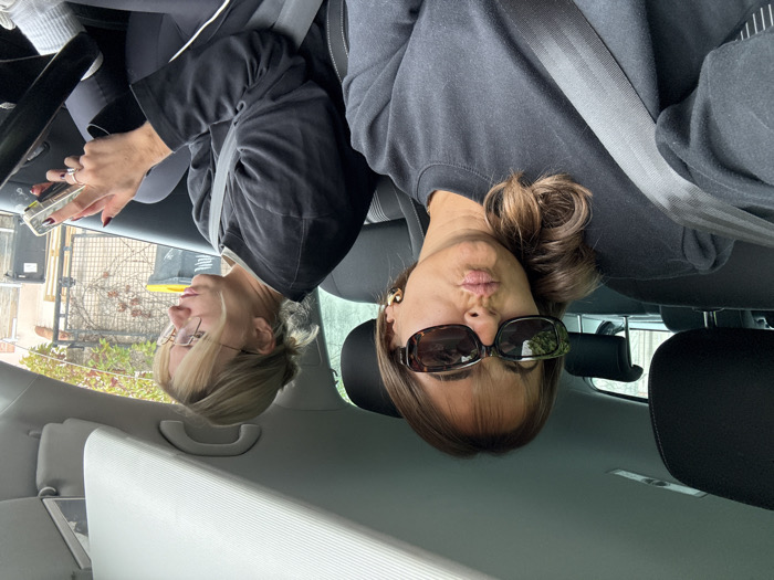 This image, taken from inside a car in Le Cannet, France, depicts two adult females. The front passenger, positioned on the left, has light brown hair with bangs. She wears dark, rectangular, tortoiseshell-frame sunglasses and gold-toned hoop earrings. Her attire consists of a dark grey long-sleeved crew-neck top, and a grey seatbelt is diagonally secured across her. Her lips are pursed in an expressive manner. The driver, situated on the right, has blonde hair styled back and wears clear-framed eyeglasses. She is dressed in a dark grey long-sleeved crew-neck top over a lighter visible layer and dark leggings. A grey seatbelt is fastened across her torso. She is actively engaging with a smartphone, holding it with both hands. Her fingernails are painted a dark red, and she wears rings on her left hand. A segment of the black steering wheel is visible beneath her hands. The car's interior features dark headrests, a light-colored ceiling, and a sun visor on the passenger side. Through the driver's side window, the exterior environment shows a paved surface, two waste bins (one yellow with a dark lid, one black with a dark lid), and a low stone wall topped with a metal gate. Behind the wall, deciduous tree branches are visible alongside green foliage covering part of a light-colored building wall. The lighting suggests an overcast sky. These external details are consistent with a European urban or suburban setting, aligning with the specified location of Le Cannet, France.