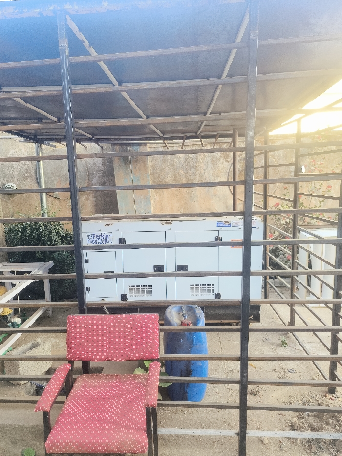 Under a metal frame structure with a partial ceiling, a white industrial generator sits against a concrete wall. In front of the generator, a worn red chair and a blue plastic drum are visible. The scene is framed by metal bars, suggesting a caged or enclosed area. Vegetation, including bushes and flowers, is seen in the background, adding a touch of nature to the industrial setting.