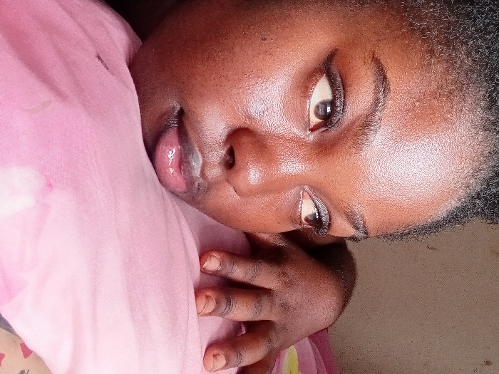 An individual with dark skin, appearing female, is positioned on her left side, resting her head on a pink textile surface. Her gaze is directed upwards and to the right of the frame. Her left hand is partially visible on the right side of the frame, resting on the pink textile; fingernails are short and unpolished. Her short, dark, textured hair is visible. Facial features include dark brown eyes with dark winged eyeliner, groomed dark eyebrows, a broad nose, and full, glossy, slightly parted lips. The skin exhibits natural texture with visible pores and highlights on the forehead, nose bridge, and lips. The pink textile displays creases and a subtle light-colored stain below the individual's chin. The background consists of a plain, light brown wall with a rough texture. The scene is located in Ejule, Nigeria.