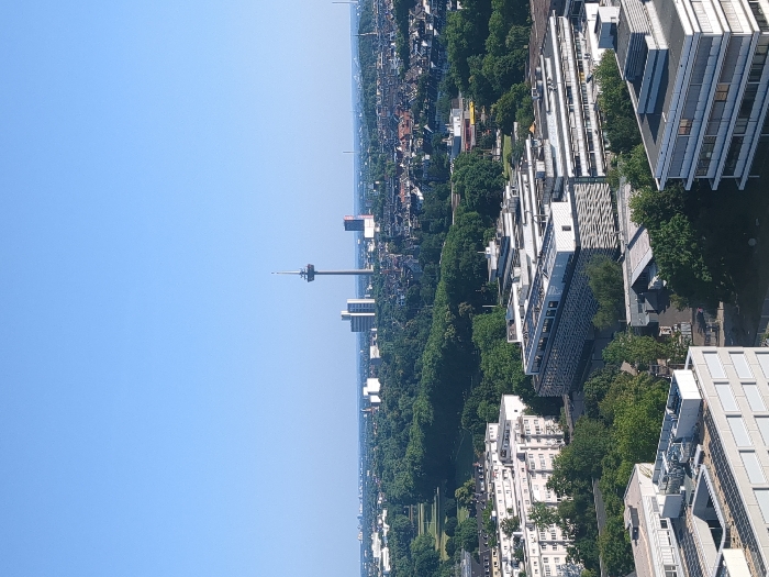 A high-angle view reveals a cityscape under a clear blue sky. Trees line the landscape, interspersed with various buildings. A prominent radio tower stands out against the horizon. Modern architecture contrasts with the more densely packed residential areas in the distance. The image suggests an urban environment blending with nature.