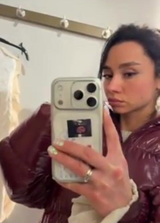 A woman in a wine-colored puffer jacket takes a selfie in a fitting room