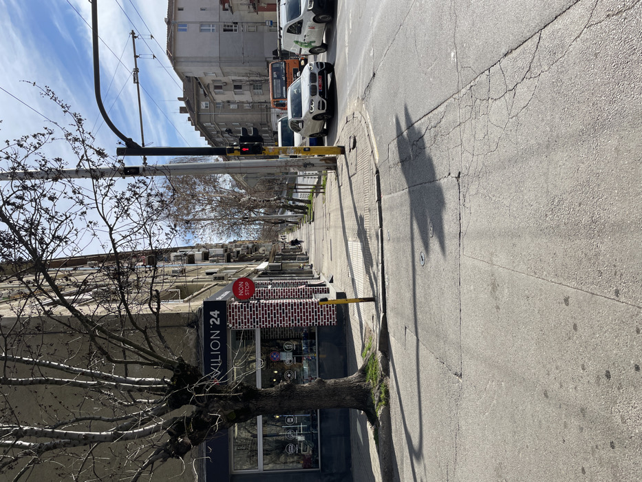 The image depicts an urban street scene in Sofia, Bulgaria, observed during daytime under a clear sky with scattered white clouds