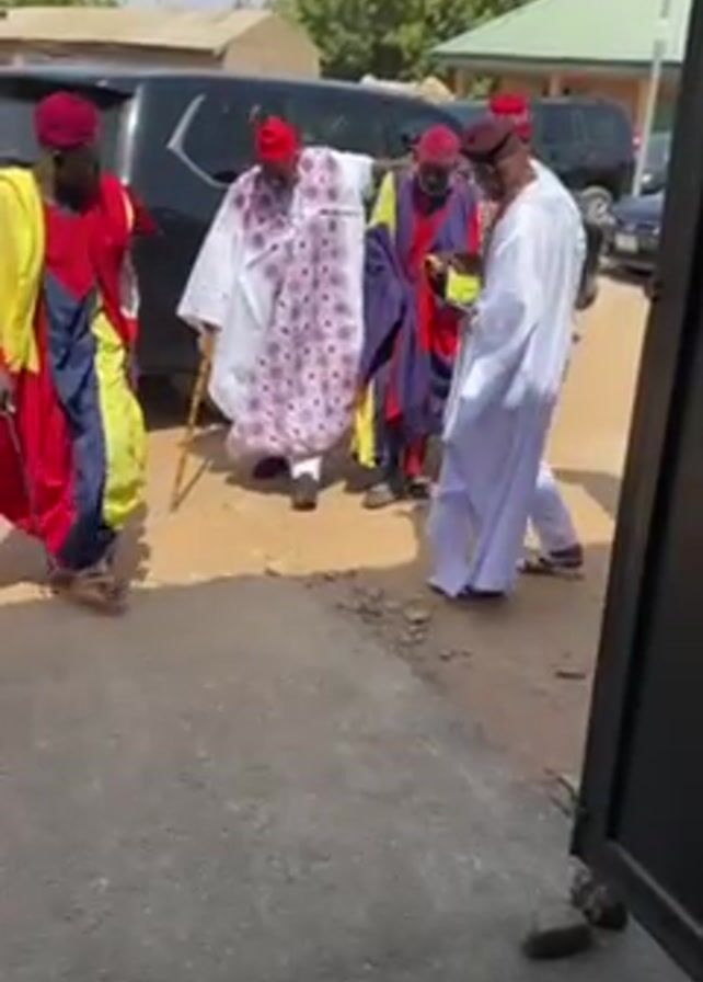 five older men in traditional African garb standing on a paved road next to a black SUV. One of the men is using a cane. They appear to be talking. The background consists of buildings and trees. Someone is recording them from behind a partially open gate. Children are near the bottom of the frame.