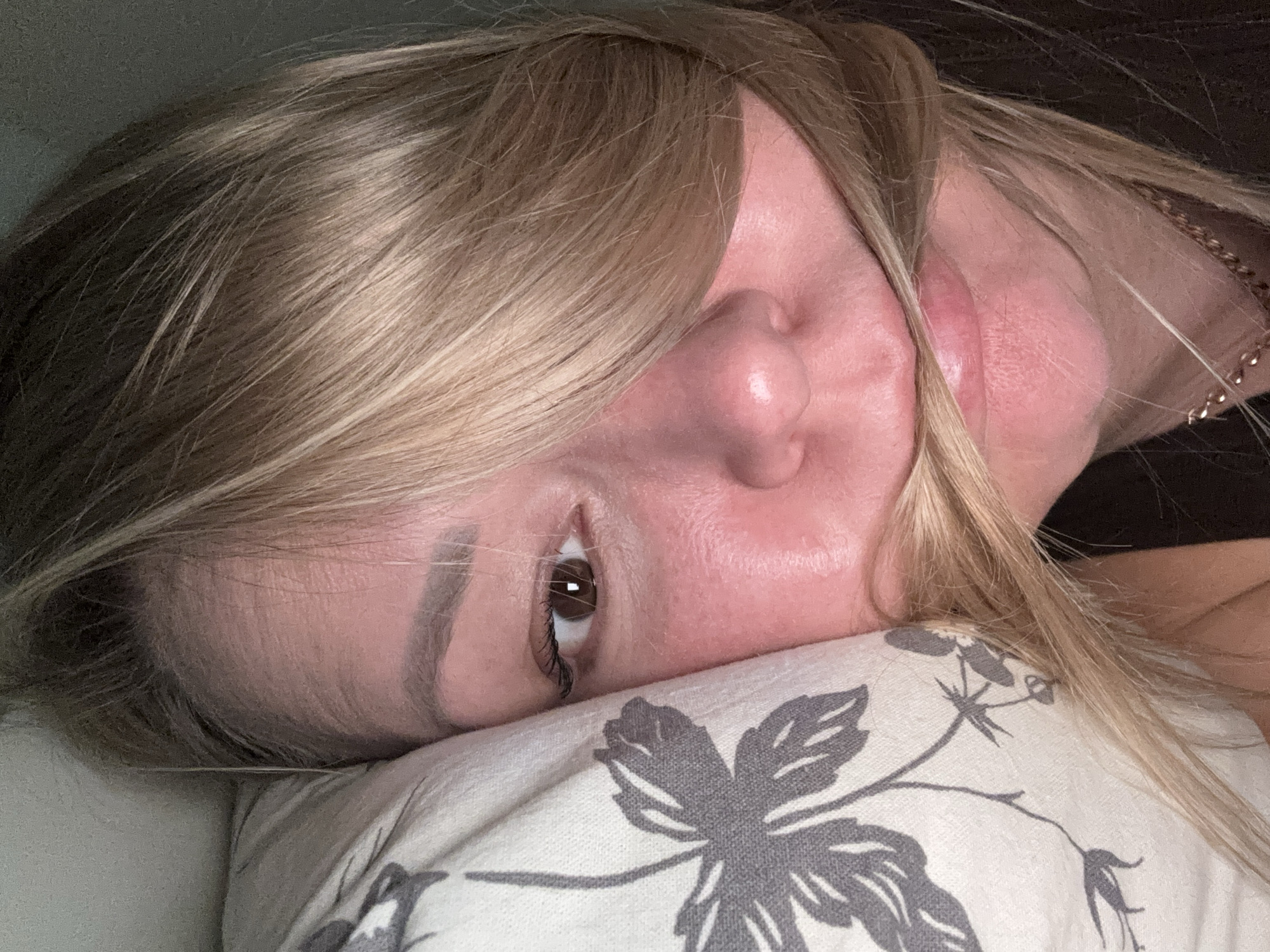 - "A close-up, tilted image shows a woman lying on her side, resting her head on a pillow" by FM-e4kNQ2, licensed under CC BY 4.0