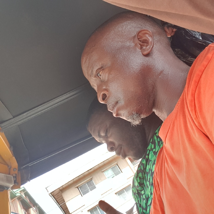 Two adult males are depicted inside a vehicle, likely in Onitsha, Nigeria, viewed from a low-angle perspective
