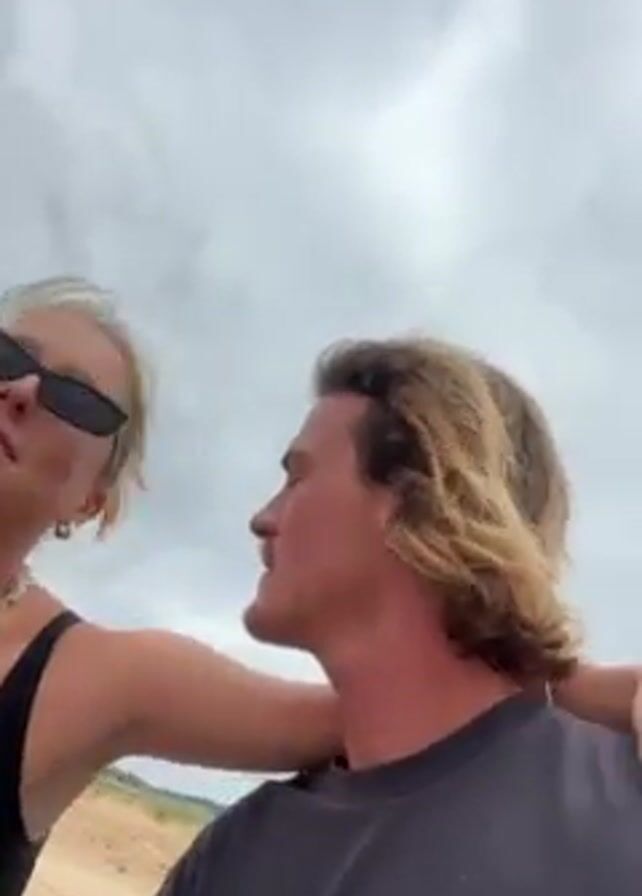 A woman wearing glasses and a large shell necklace kisses a man with long wavy hair. She has her arm around his shoulders. He is wearing a black t-shirt. The background is a cloudy sky. They appear to be outdoors.