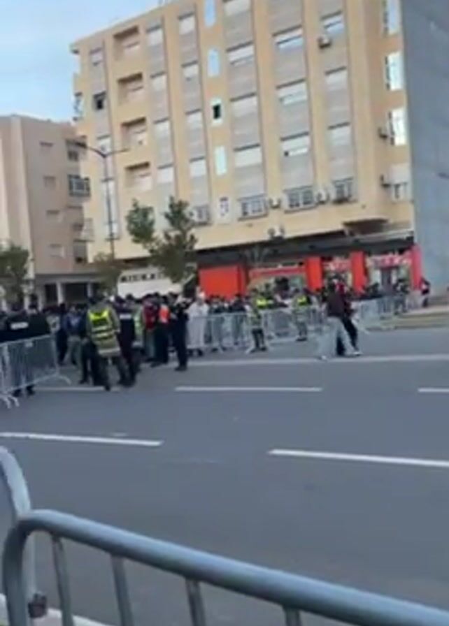 group of people gathered behind metal barricades on a city street. Uniformed personnel, some wearing vests with "FORCES AUXILIAIRES" printed on them, stand near the barricades. The camera follows one of the uniformed personnel as he walks alongside a barricade. Buildings are visible in the background under a partially cloudy sky.