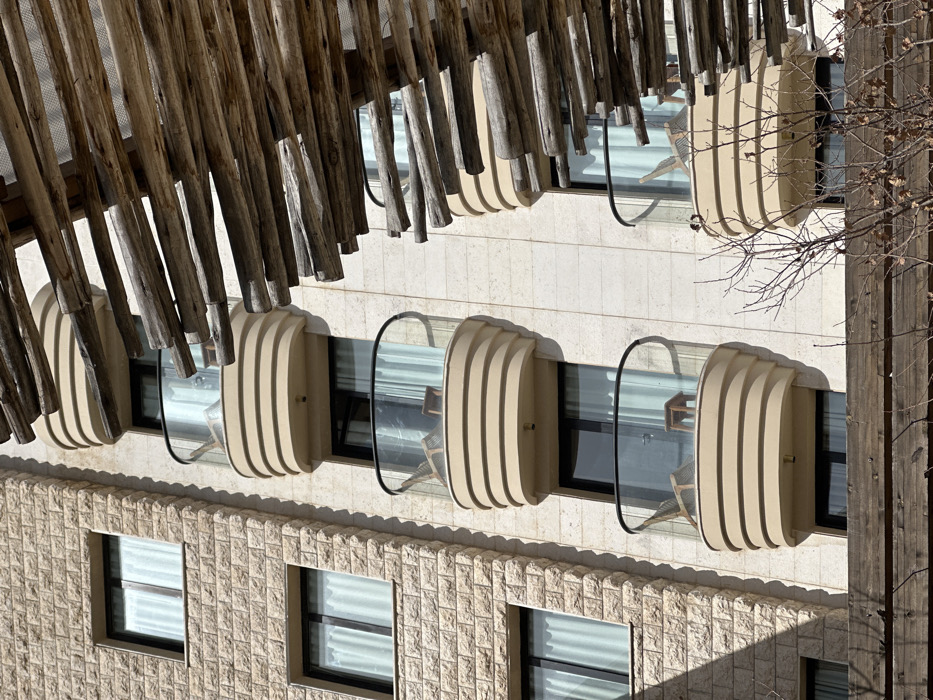 The image captures a partial, upward-angled view of two multi-story buildings in Safed, Israel, partially obscured by a wooden pergola in the foreground. The foreground features a structure composed of numerous parallel, weathered wooden beams, appearing to be rough-hewn logs or branches, extending diagonally from the upper right to the lower center of the frame. Below this structure, bare tree branches and dried foliage are visible. The building on the left exhibits a facade of light-colored, rough-cut stone blocks, consistent with ashlar masonry. It contains multiple rectangular windows with dark frames and light-colored curtains visible behind the glass. The building on the right presents a more modern architectural style with a smooth, light-colored stone or concrete facade. This building features several projecting, curved balconies stacked vertically. Each balcony has a horizontally-ribbed, beige-colored base and a clear glass railing topped with a dark rail. Behind the glass railings, through open doorways or windows, light-colored curtains are visible. On each visible balcony, at least one light-colored wooden chair is present, and some balconies also include a small wooden table. The scene is illuminated by natural sunlight, casting shadows that define the architectural elements. No individuals are depicted.