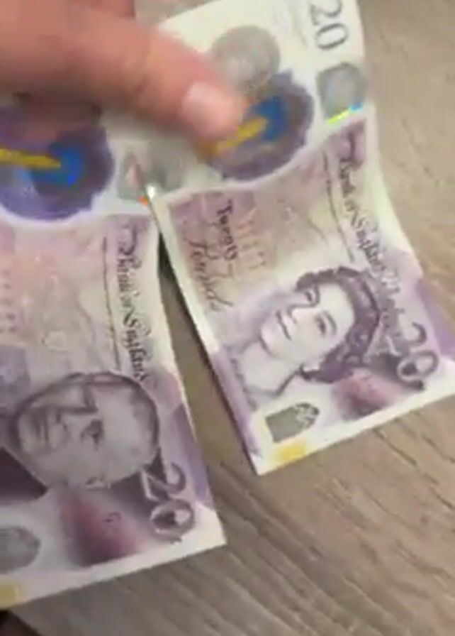 A hand is shuffling through a stack of Bank of England notes, mainly £20 notes