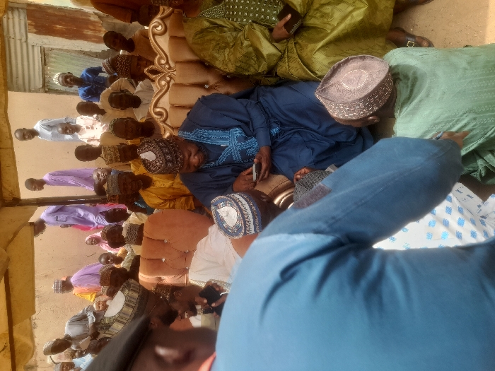 group of men gathered under a canopy in Gusau, Nigeria. The men are sitting on chairs and the ground, and some are standing. The men are all wearing traditional Nigerian clothing. One man is seated on a sofa with a blue garment and a white cap. He is looking at a phone in his hand. Another man wearing a green garment and a grey cap is sitting on the ground. The men are talking and interacting with each other. The setting is an outdoor courtyard with a dirt floor, a white wall, and a brick wall in the background. There is a canopy overhead providing shade. The men are gathered for an event or celebration.