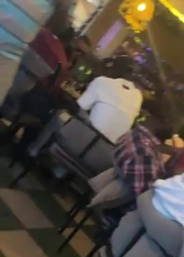 interior of what appears to be a bar or restaurant. Several people are seated at high tables and stools. A large TV screen displaying a soccer game is visible. The lighting is warm, with decorative lamps hanging from the ceiling. A man wearing a striped shirt is standing and looking towards the camera at one point. The camera moves around, providing glimpses of other patrons and the bar area.