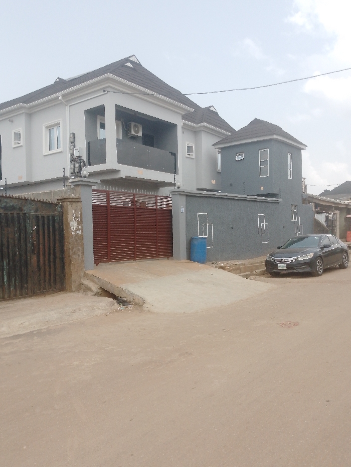 An overhead-lit, exterior view captures a two-story residential building and its surroundings in the city of Unknown, Unknown