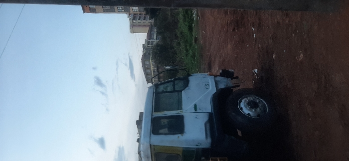 An old, faded white truck sits on a red dirt ground near vegetation and a multi-story building. The sky transitions from light blue to a darker shade, possibly indicating dusk or dawn. The truck shows signs of wear and tear, with visible paint imperfections. A large tire is positioned prominently in the foreground. The scene has an unkempt, somewhat neglected feel.